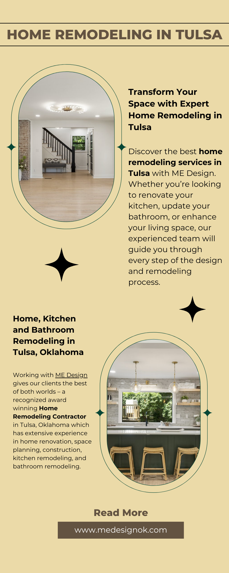 With ME Design, find the top home remodeling services in Tulsa. Our skilled staff will help you with every stage of the design and renovation process, whether your goal is to modernize your bathroom, improve your living area, or rebuild your kitchen. Allow us to assist you in designing a stunning, useful house that fits your needs and expresses your personal flair. Reach out to us right now to begin your remodeling project! Visit today: https://medesignok.com/remodeling/